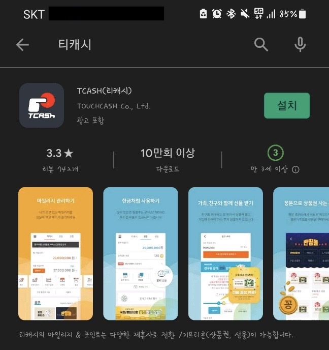 Google Play Store/App store에서 Tcash(티캐시) 앱을 설치하고 실행한다.
