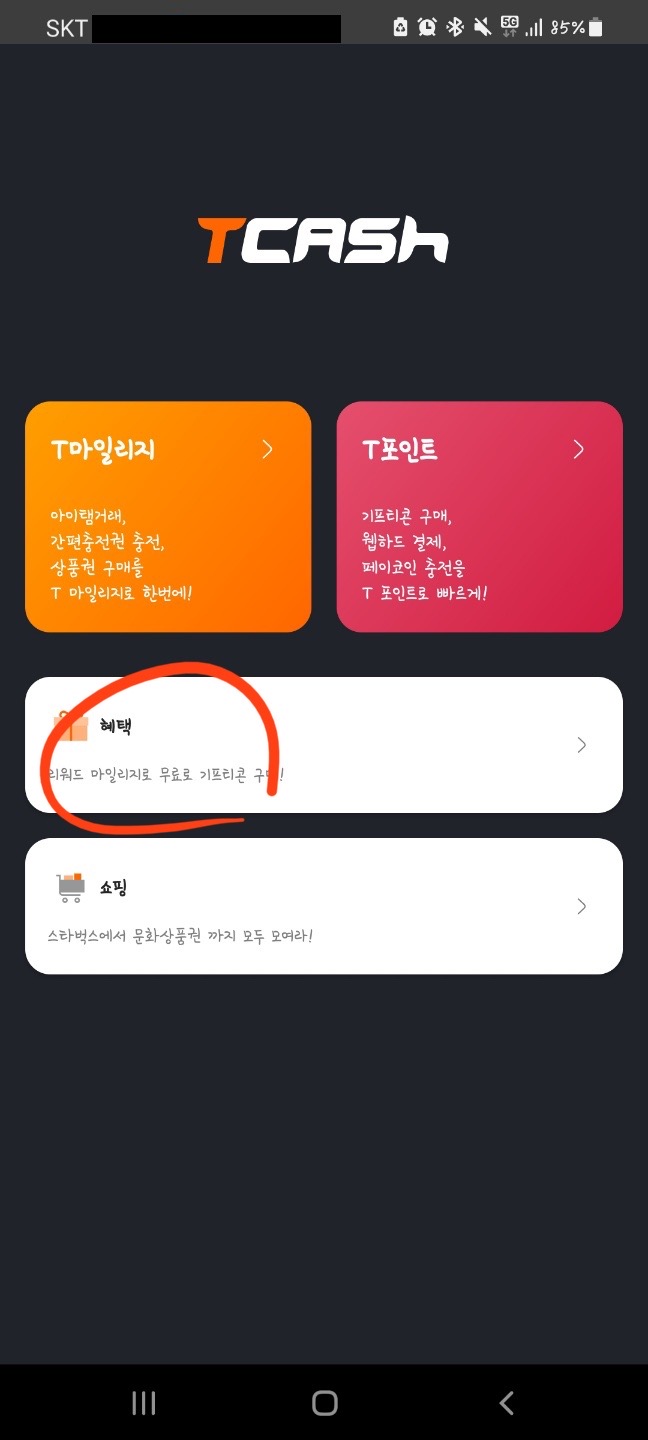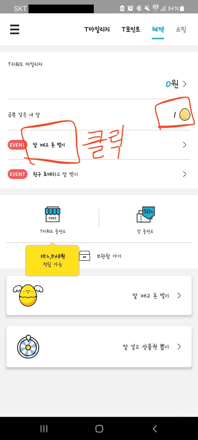 하단의 '다음'을 누르면 비로소 티캐시 회원가입이 완료된다. Tcash 앱 홈 화면에서 '혜택' > '알 깨고 돈 벌기'로 이동하면 지급받은 알을 깰 수 있다.