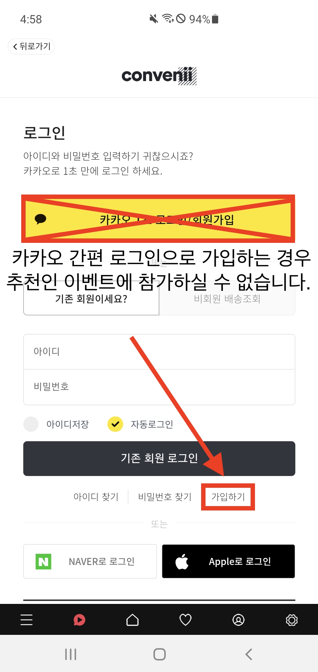 그리고 컨비니 앱 하단 5번째 메뉴를 클릭하여 로그인 페이지로 이동한다.