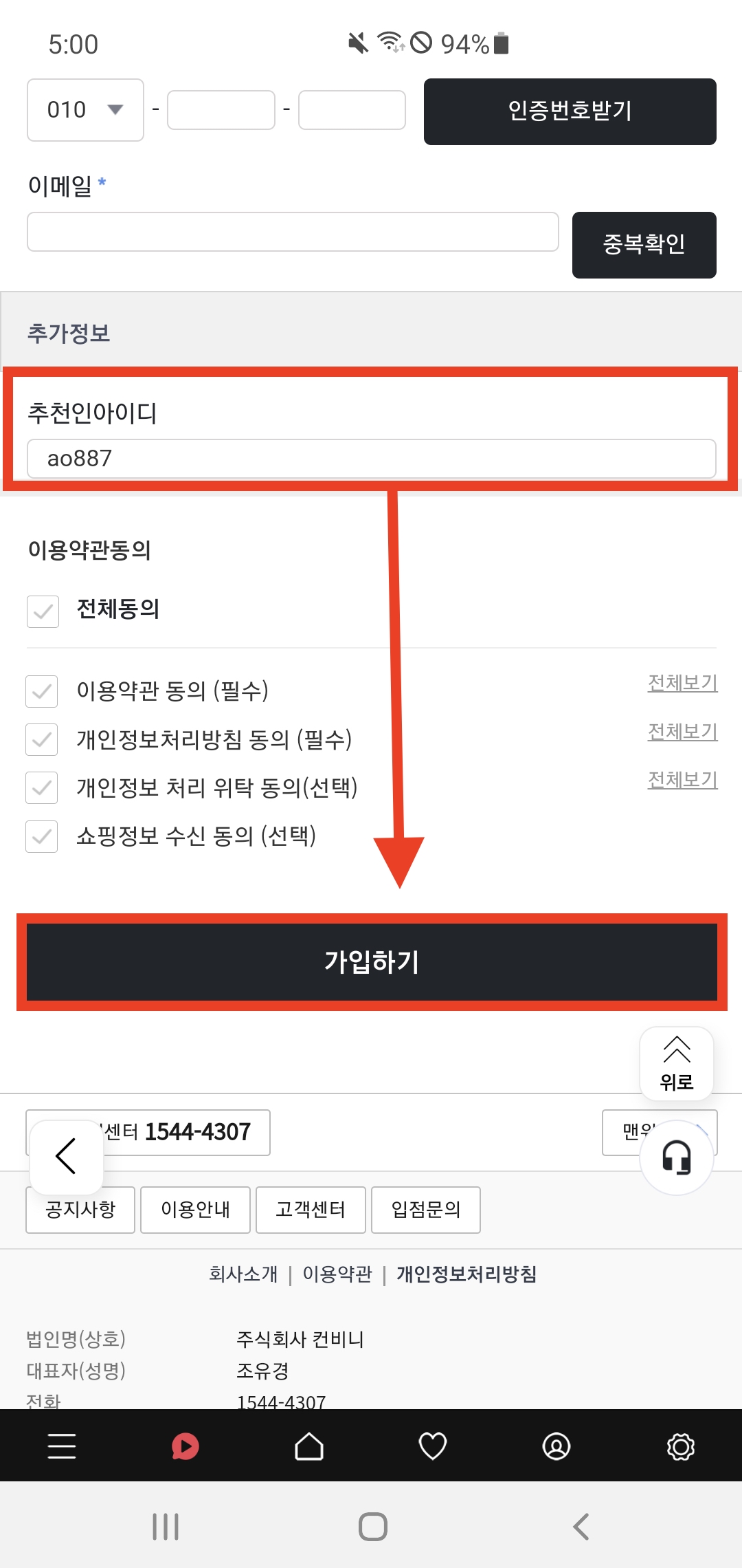 제일 아래로 스크롤을 내리면 추천인 아이디를 입력할 수 있는데 여기에 ao887을 입력하면 된다.