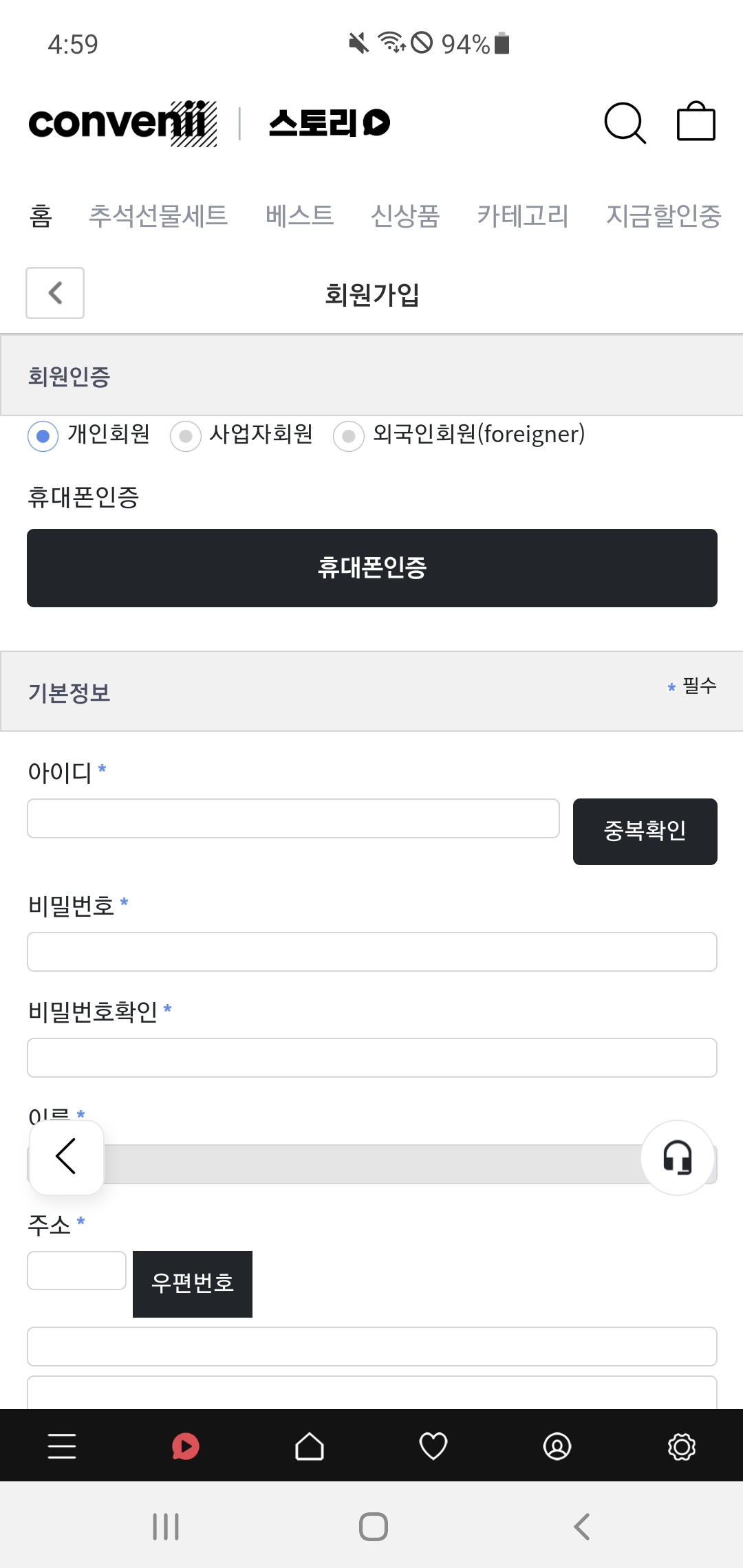 그리고 회원인증에서 휴대폰 인증을 진행하면 아이디와 비밀번호, 이름과 주소 등을 입력하게 된다.