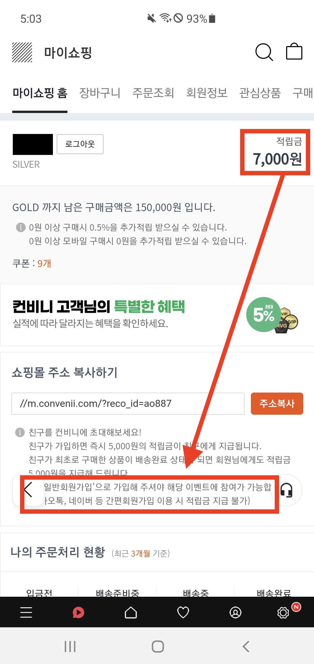 회원가입이 정상적으로 완료되었다. 마이쇼핑 홈 페이지에서 적립금 7,000원이 지급된 것을 확인할 수 있고, 아래 유의사항을 보면 일반회원가입을 제외한 간편 로그인을 통해 회원가입을 진행하면 추천인 적립금 지급이 불가하다고 적혀있다.