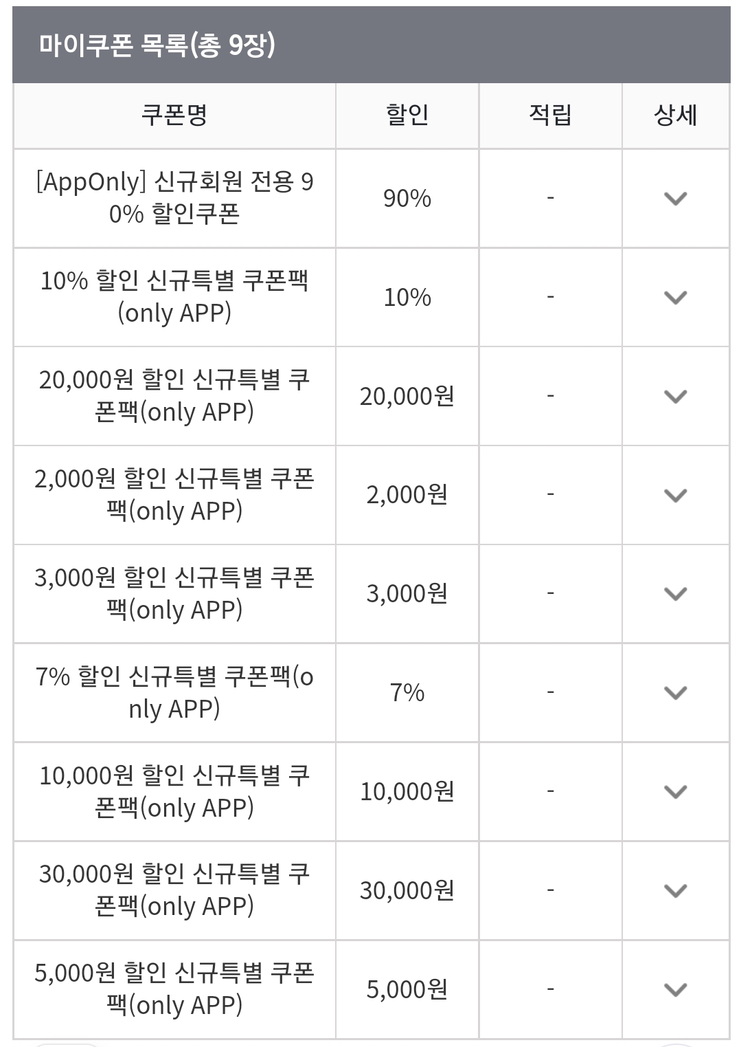 3번째 사진은 신규회원 특별 쿠폰 9종이다. 가입과 동시에 지급된다.