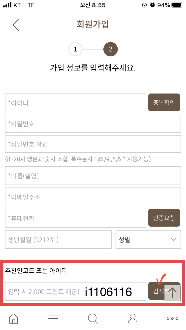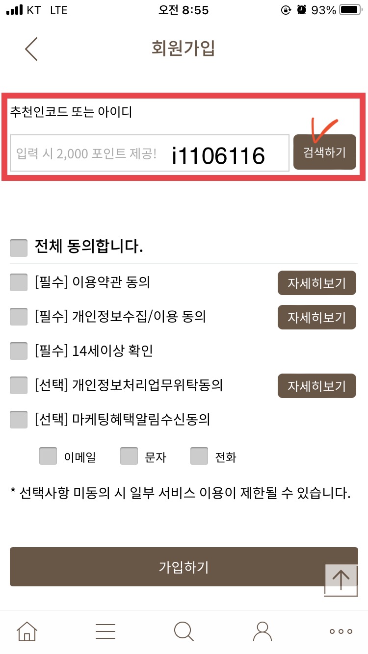 그리고 제일 아래에 보면 '추천인코드 또는 아이디'라는 칸이 있는데 여기에 'i1106116'을 입력하고 '검색하기'를 누른다.