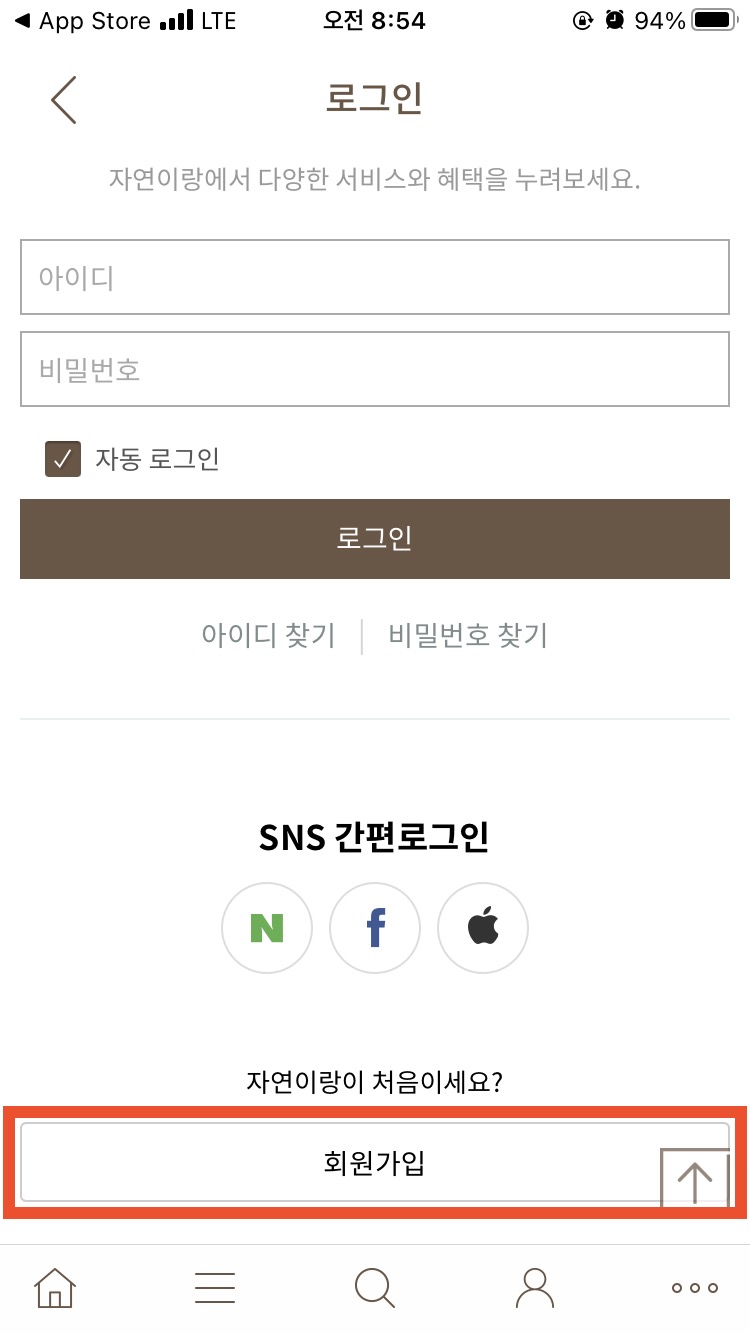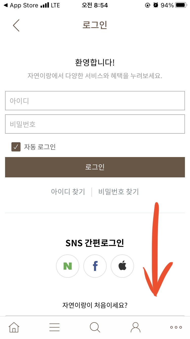 자연이랑 앱을 실행하고 홈 화면 하단에 보이는 4번째 탭 (프로필 모양)을 터치한다.