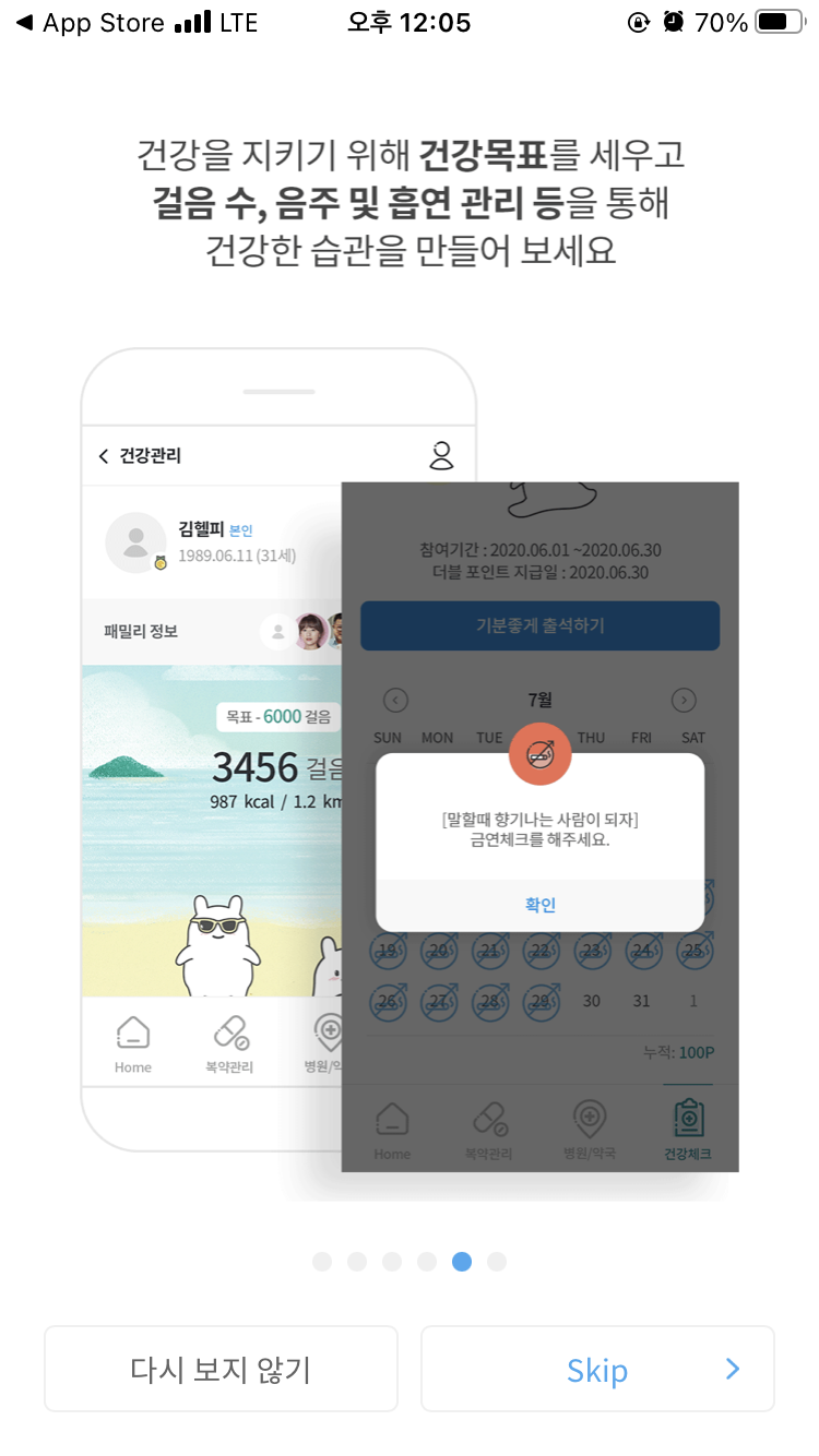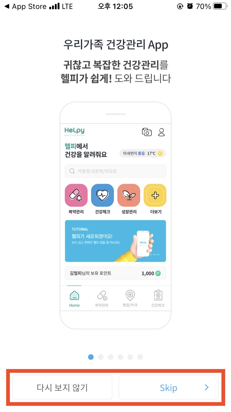 앱을 실행하면 헬피를 소개하는 슬라이드 이미지 5장이 등장하는데, 하단의 '다시 보지 않기'를 누르거나 'Skip'을 누른다.