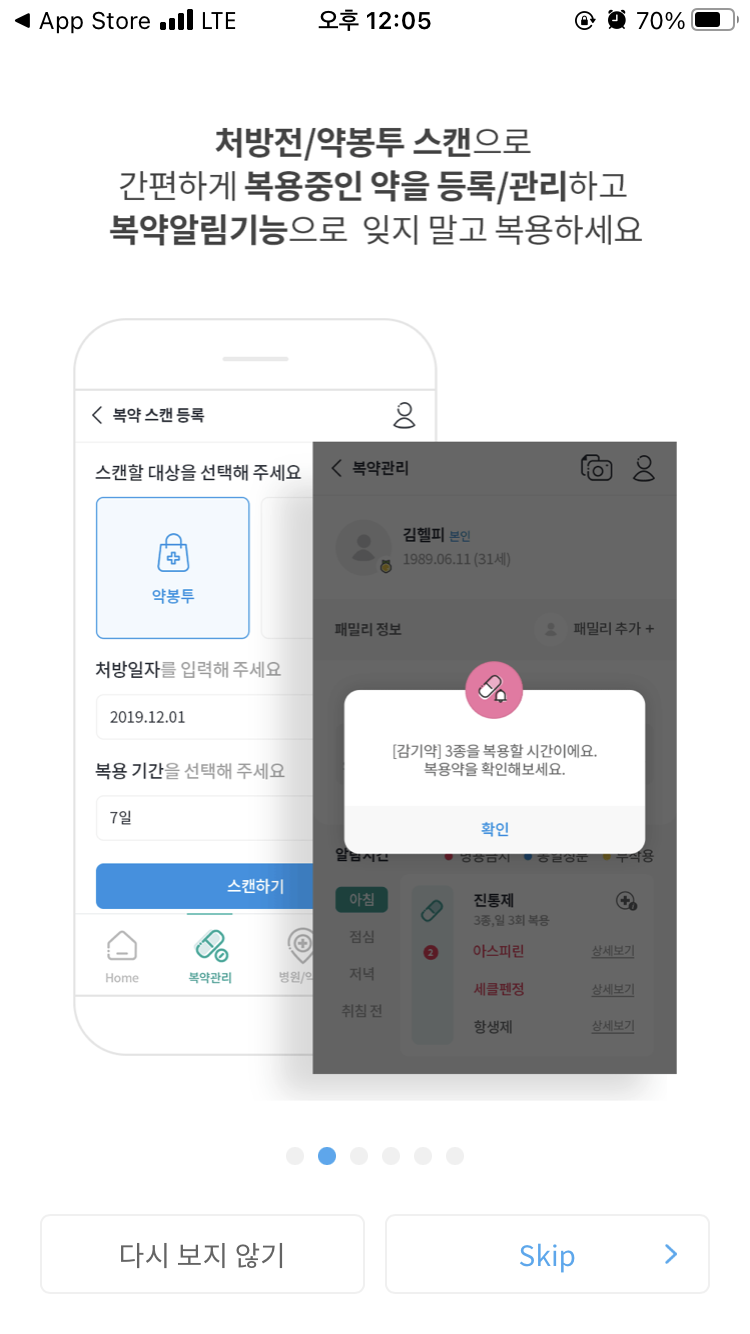귀찮고 복잡한 건강 관리는 이제 그만하자. 처방전과 약봉투 스캔으로 간편하게 복용중인 약을 등록하고 관리할 수 있다. 하루에 특정 시간마다 약을 복용해야 하는데 나도 모르게 깜빡하는 종종 있다. 이런 경우에 헬피 앱에서 약을 등록하고 알림을 설정하면 올바른 시간에 약을 먹을 수 있다.