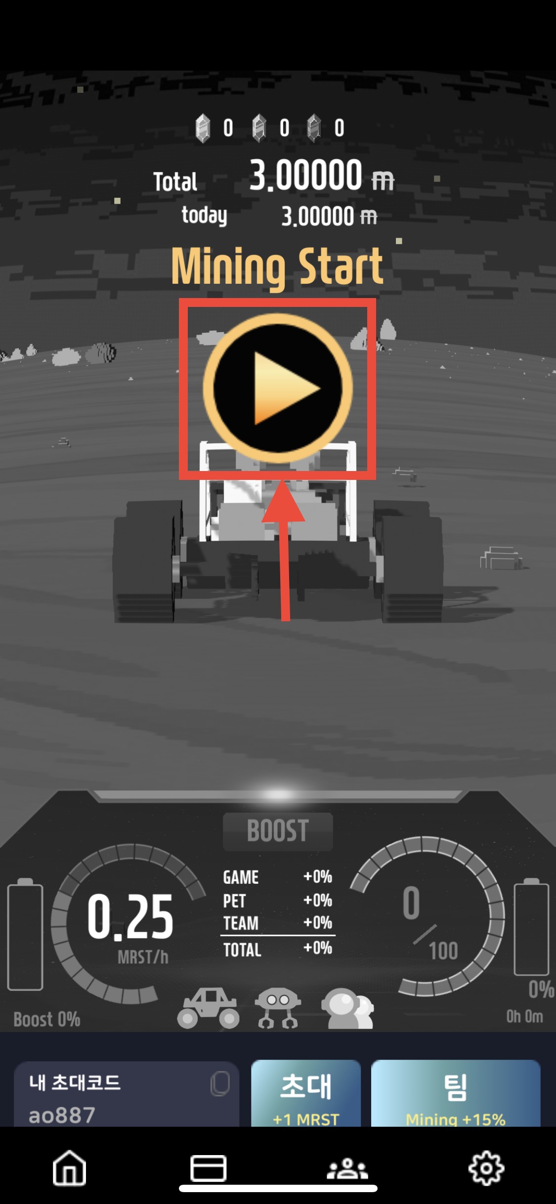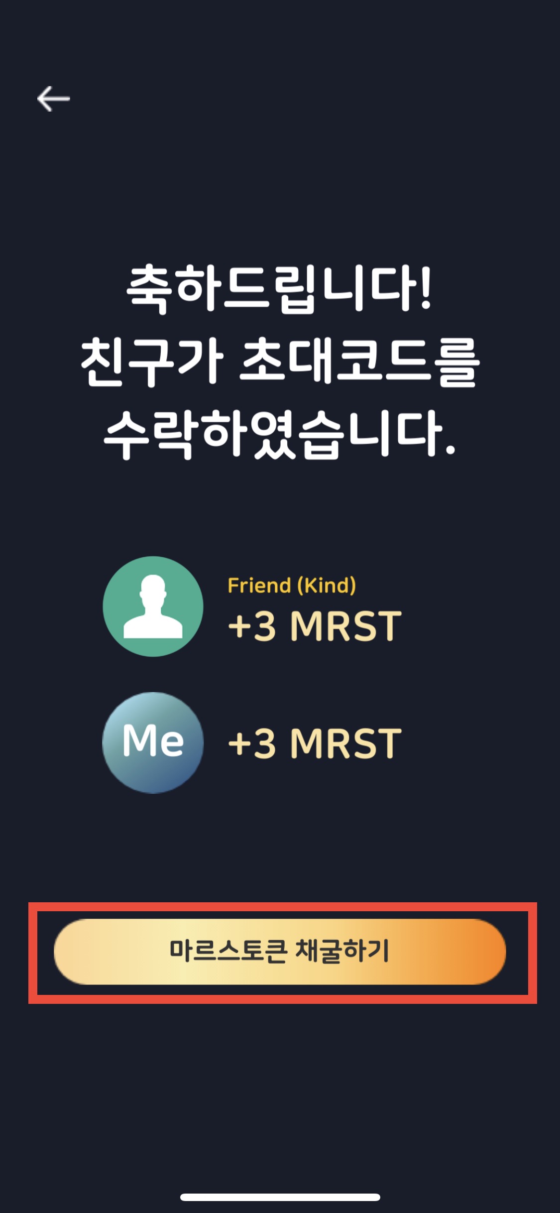 6. 초대링크를 통해 가입한 유저의 경우 회원가입 페이지에서 따로 초대코드를 입력할 필요가 없습니다. 자동으로 초대코드가 입력되어 3MRST를 추가로 받게 됩니다. '마르스토큰 채굴하기'를 누르면 오른쪽 사진처럼 나타나는데 여기서 화면 중앙에 있는 ► 버튼을 누르면 채굴이 진행됩니다.