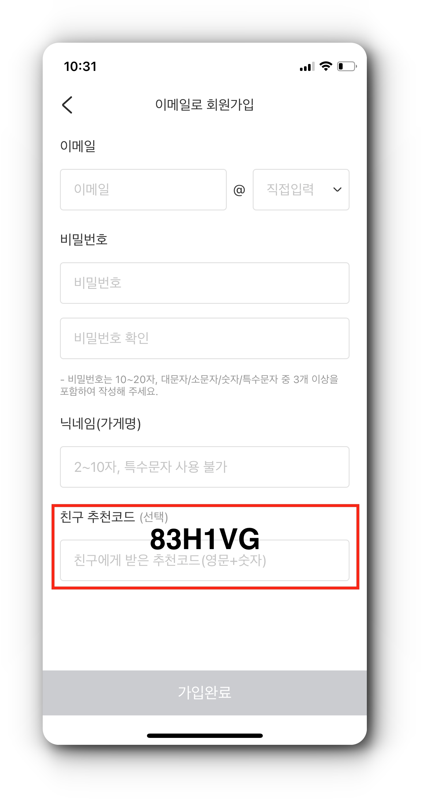 - 친구 추천코드 83H1VG 입력