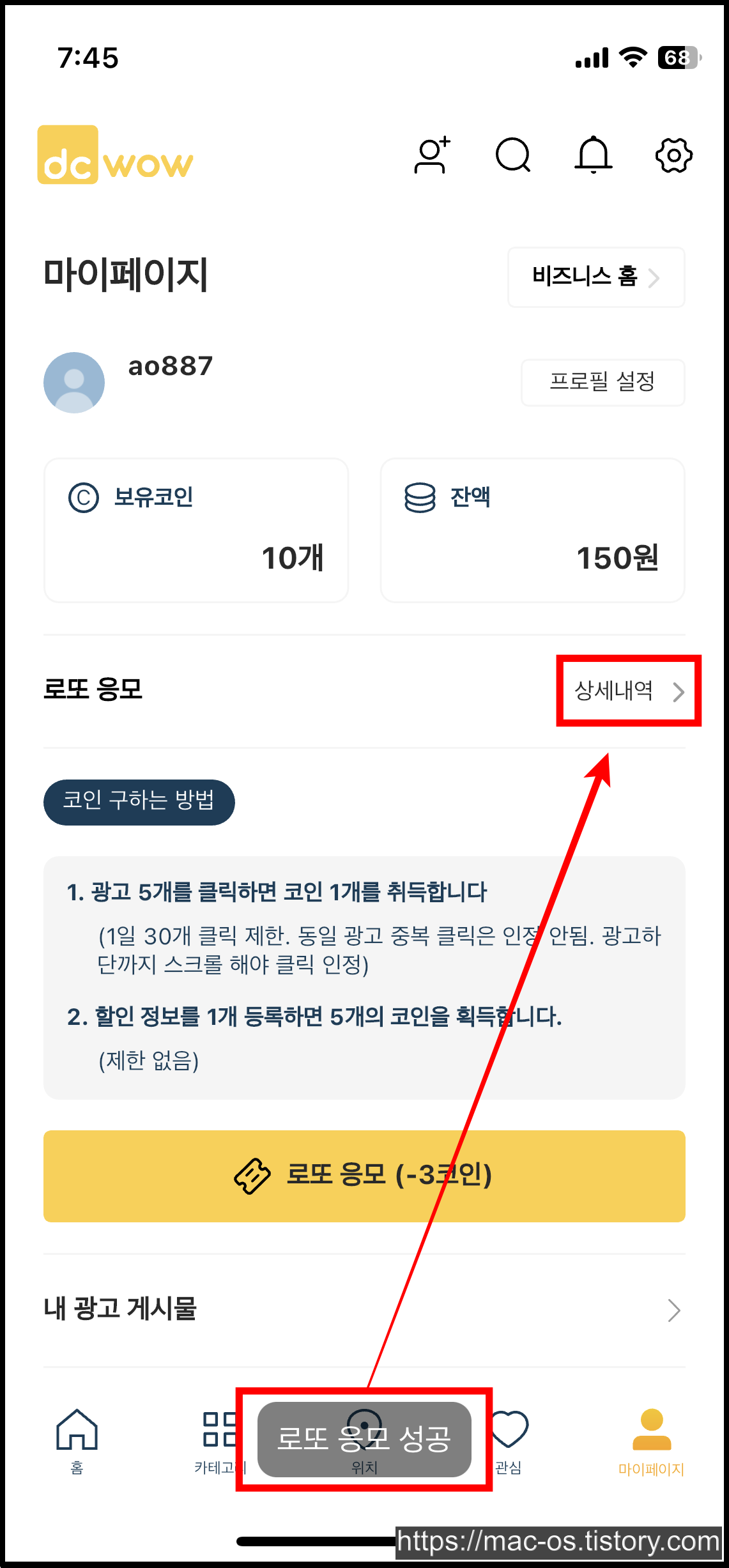 디씨와우는 할인정보를 보면 돈과 코인을 주는 앱이다. 돈은 현금이라 보면 되고, 코인은 3개를 모을 때마다 매주 진행되는 로또에 1번 참여할 수 있다.